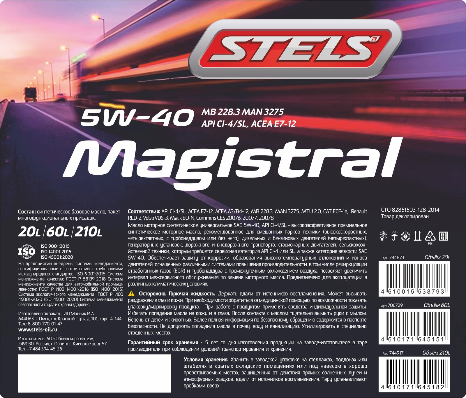 Масло моторное STELS Magistral 5W40 210л